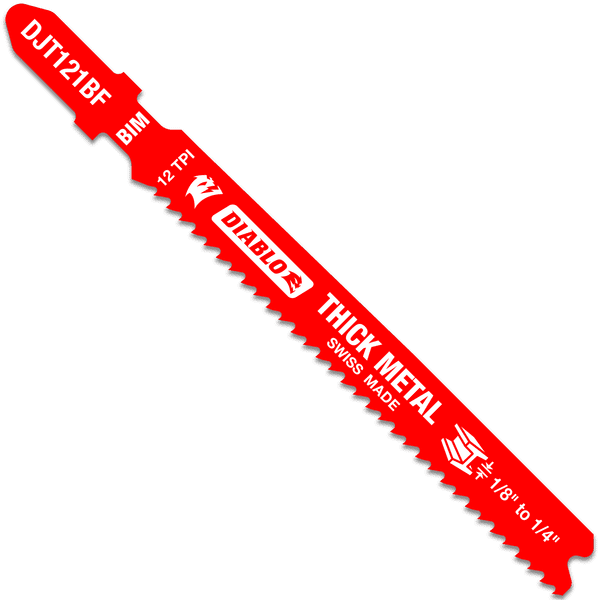 Diablo’s bi-metal teeth jig saw blades are specifically designed for maximum durability, longer life and speed in thick metal applications ranging from 1/8” to 1/4” thickness. These high-performance blades feature an ultra-hardened cutting edge to deliver up to 5X longer life than standard blades. A back taper blade design and Perma-SHIELD® non-stick coating reduces heat and pitch build up for fast and clean cuts in metal. T-shank design fits all combo and most U-shank cordless and corded jig saws.