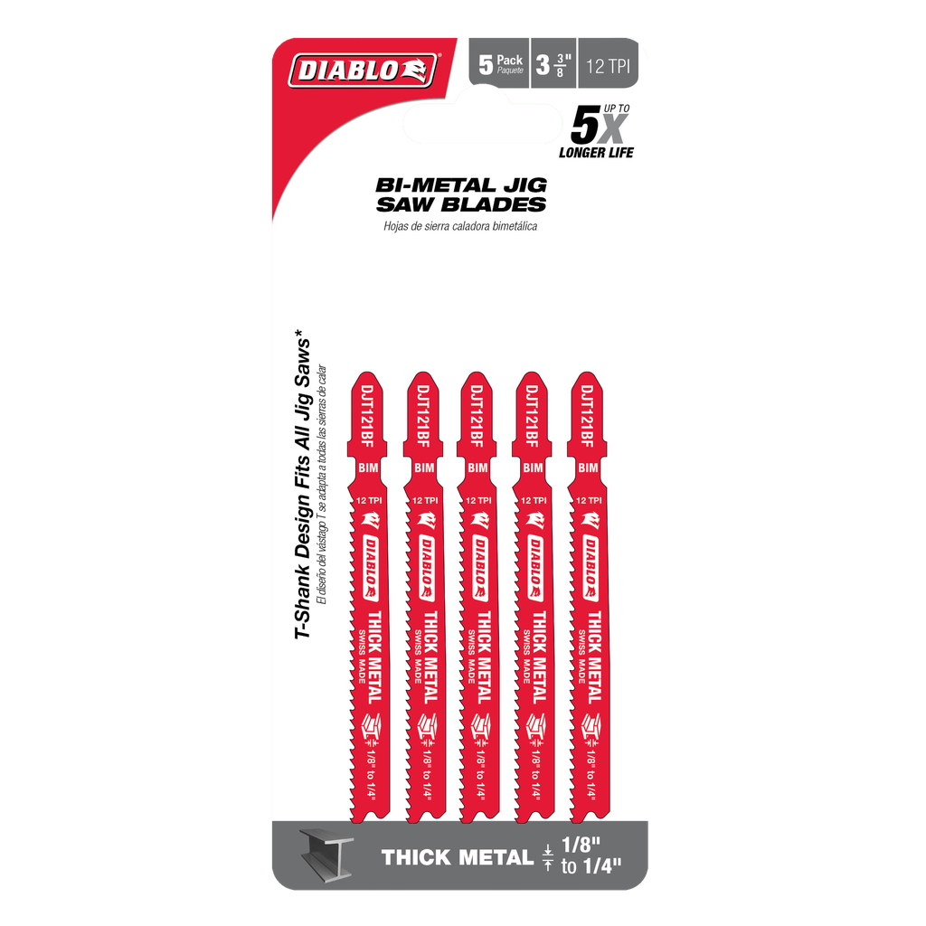 Diablo’s bi-metal teeth jig saw blades are specifically designed for maximum durability, longer life and speed in thick metal applications ranging from 1/8” to 1/4” thickness. These high-performance blades feature an ultra-hardened cutting edge to deliver up to 5X longer life than standard blades. A back taper blade design and Perma-SHIELD® non-stick coating reduces heat and pitch build up for fast and clean cuts in metal. T-shank design fits all combo and most U-shank cordless and corded jig saws.