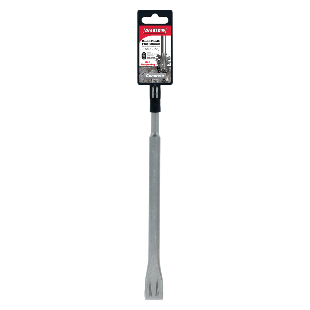 Diablo’s SDS-Plus and SDS-Max Dual-Tooth Flat Chisels deliver extreme durability and stability in general demolition work, adjustment work, restoring joints and clearing reinforcements. A unique heat treatment process strengthens the steel body to withstand the stress and impact of high-powered hammer drills in concrete. The Dual-Tooth jam-free head demolishes concrete by creating multidirectional fractures for faster material removal. Self-sharpening tip increases productivity and extends the tools life. Optimized for maximum performance in corded and cordless SDS-Plus and SDS-Max rotary hammers.