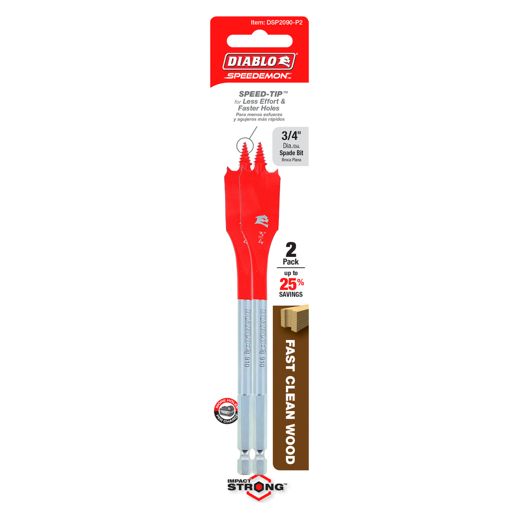 Diablo’s SPEEDemon™ Spade Bit range provides one of the fastest, most effortless hole drilling solutions on the market for fast, clean wood. The high-performance SPEED-TIP™ design self-feeds for faster hole making when compared to traditional spade bits. An optimized Curved Paddle design enhances the chip evacuation process for more holes per charge. This range is Impact Strong™ for increased shank stability and durability in cordless and corded impact and drill drivers.