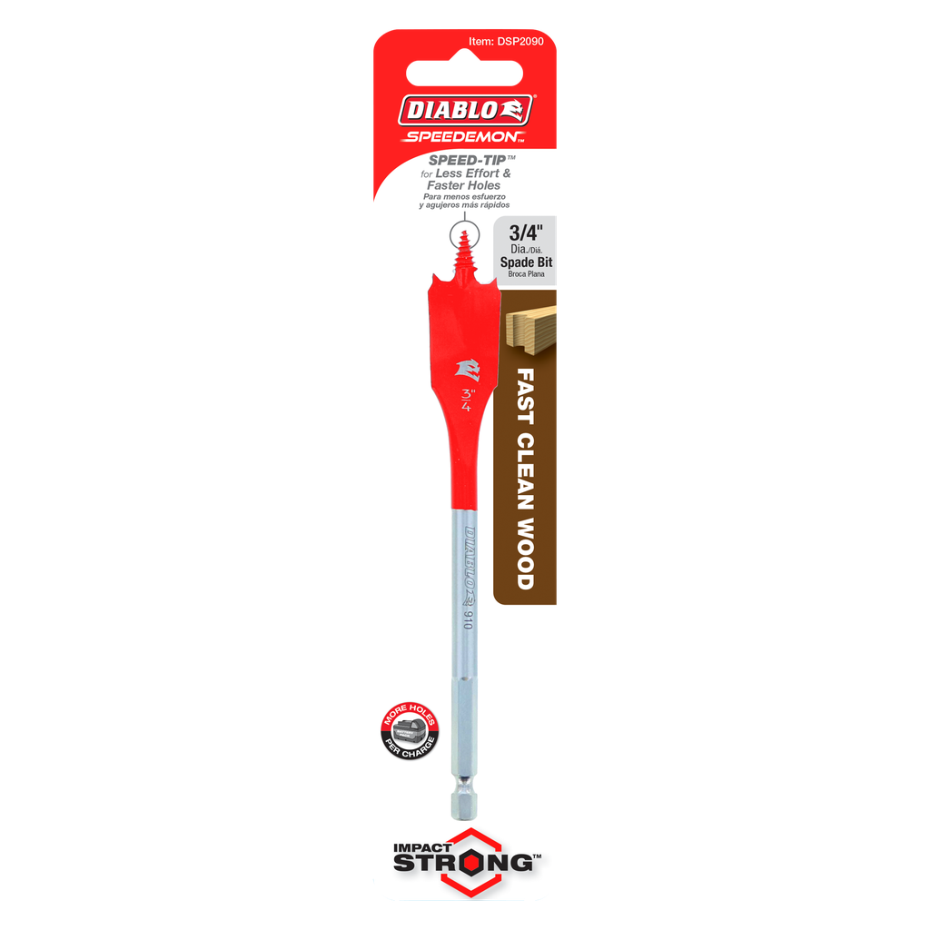 Engineered for exceptional performance, the 3/4 inch by 6 inch SPEEDemon™ Spade Bit from Diablo Tools is designed to tackle a wide range of projects in both softwoods and hardwoods. Its innovative angled spur cutting edge allows for precise scoring, producing clean holes while minimizing blowout, making it an ideal choice for woodworkers and DIY enthusiasts alike. Featuring a unique optimized curved paddle design, this bit efficiently removes chip build-up, allowing for more holes per charge, while the SPEED-TIP™ self-feed design ensures effortless drilling with minimal exertion. With enhanced durability provided by Impact Strong™ technology, it promises reliability in both cordless and corded impact and drill drivers, making it a versatile addition to your toolkit.