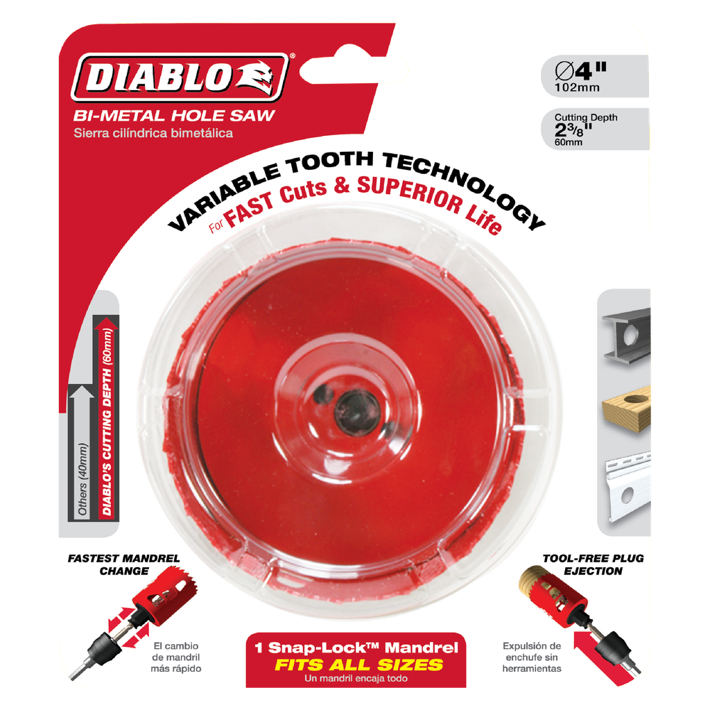 Diablo’s new, high performance hole saws deliver faster cutting performance and increased productivity. Unlike anything on the market, Diablo’s hole saw system and mandrel design simplify the attachment process for fast and efficient hole saw mounting. These radical new hole saws provide ultimate cutting length to bore deeper holes in a single pass, tool-free plug ejection and Variable Tooth Design for faster cuts.