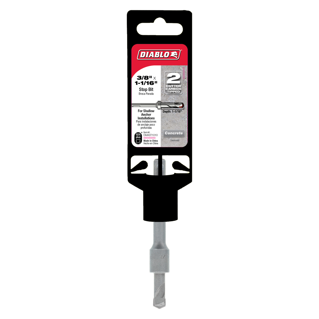 Diablo’s SDS-Plus 2-cutter carbide-tipped hammer stop bits provide one of the fastest and longest lasting drilling solutions on the market for concrete. Featuring a Stop Collar, these bits have a pre-determined stopping point for efficient shallow anchor installations. Optimized with a unique brazing and hardening process, the carbide tips extends life and productivity, allowing users to drill fast, accurate holes. Optimized for maximum performance in corded and cordless SDS-Plus rotary hammers.