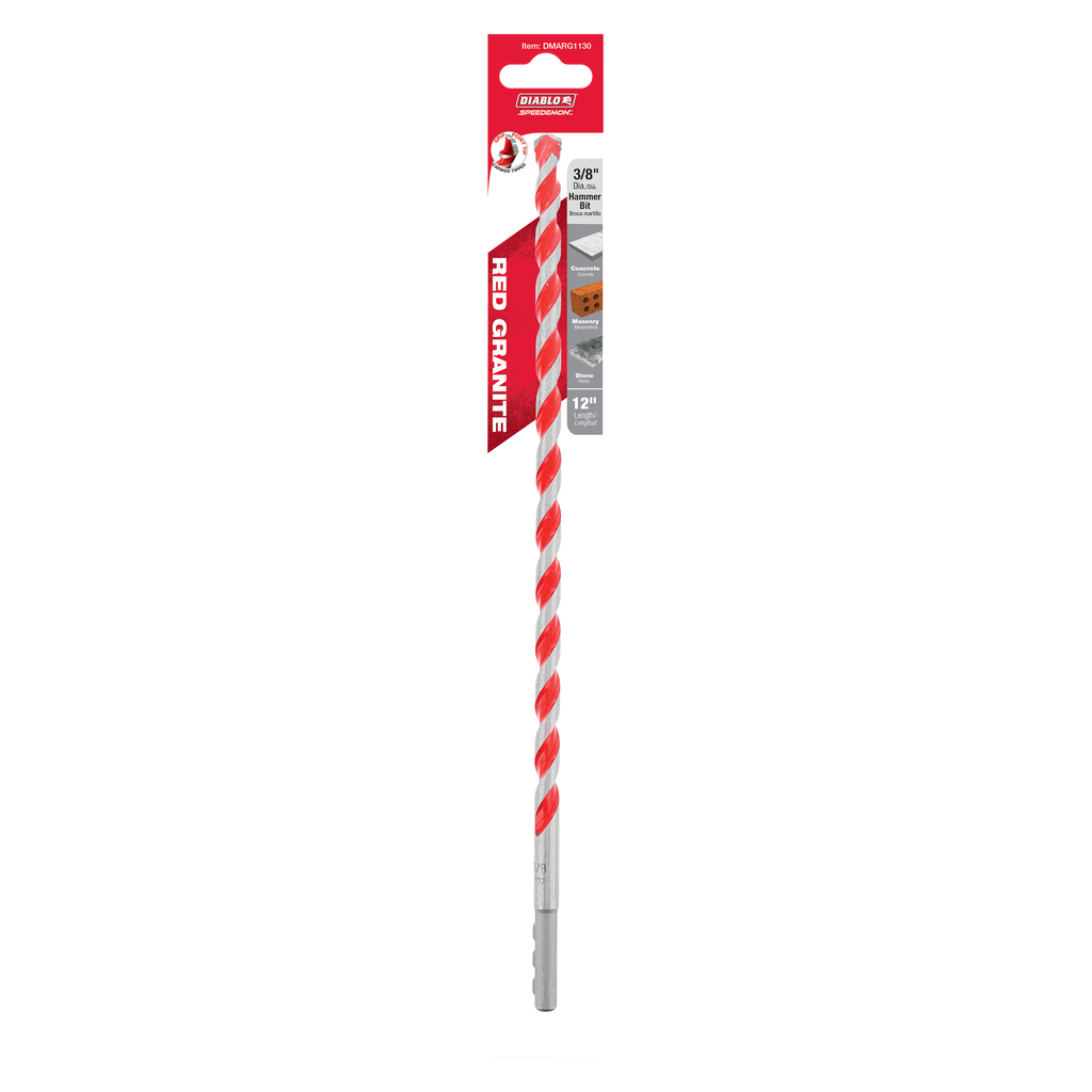 Diablo’s SPEEDemon ™ Red Granite Carbide Tipped Hammer Drill Bit range provides one of the fastest and longest lasting drilling solutions on the market for concrete, masonry and stone. Optimized with a unique brazing and hardening process, the carbide tip extends life and productivity, allowing users to drill fast, accurate holes. The multi-ground Grip Point tip design allows for aggressive starts that produce clean, fast holes. This range is Impact Strong™ for increased shank stability and durability in cordless and corded impact and drill drivers. This range delivers extreme durability in cordless and corded impact and drill drivers.