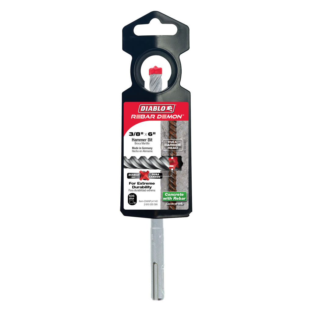 Diablo’s revolutionary, most complete range of SDS-Plus and SDS-Max Rebar Demon™ 4-cutter full-carbide head hammer drill bits are the only bits designed to be the most durable, fastest and coolest solutions on the market. The Rebar Demon bits feature up to 2X more Dura-Carbide to withstand up to 1800°F of intense heat whereas standard bits fail at 800°F. Diablo’s impact resistant 4-cutter full-carbide head withstands the stress of high-powered hammer drills and the impact of rebar by taking small bites of rebar to deliver controlled carbide wear, reduced vibration and up to 7X longer life. Produced with Tri-Metal Fusion Welding, the full-carbide head resists heat and prevents breakage in extreme impact situations. Precision Tip delivers the stability and accuracy required to produce fast, precise holes in reinforced concrete for anchor setting.