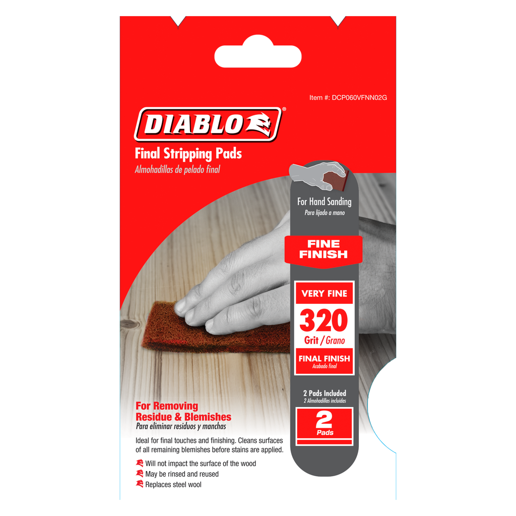 Diablo’s premium final stripping pads include break-through innovations for superior sanding performance, extended sanding life and increased hand-sanding productivity. Featuring a premium silicone carbide blend, these pads provide a superior finish, faster material removal and offer an extra-long sanding life in wet and dry sanding applications. Non-woven nylon fibers are fully penetrated with a flexible resin and grit allowing for fresh grit to be exposed as the pad is worn. A durable nylon pad design withstands extreme applications and wear to maintain structure integrity and shape, allowing for continued use and longer sanding life. Ideal for final touches and finishing, Diablo’s stripping pads clean surfaces of any remaining blemishes before stains are to be applied. The go-to alternate for steel wool, Diablo’s finish stripping pads deliver consistent finishes, longer life and extreme durability.