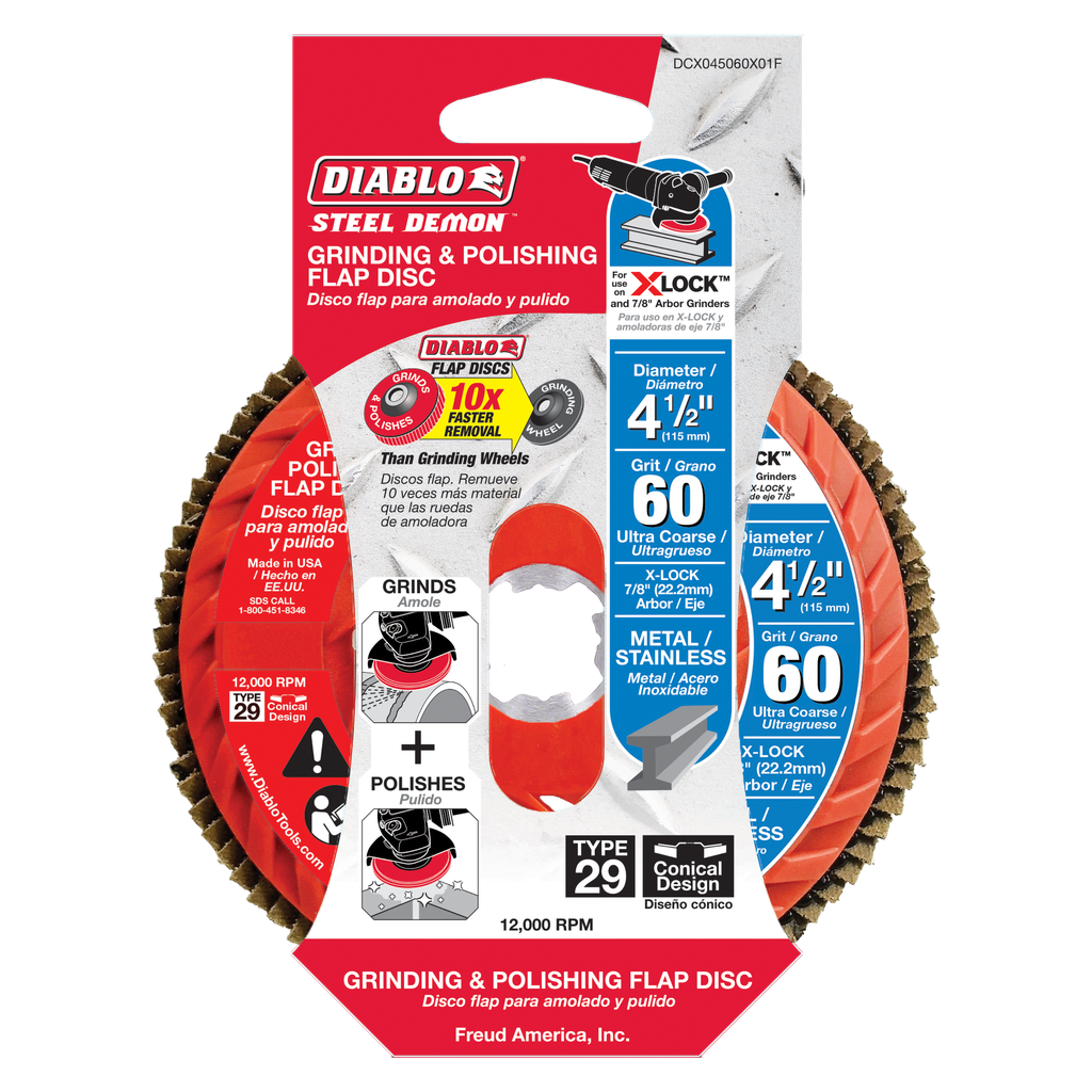 Diablo’s Steel Demon Grinding and Polishing Flap Discs grind and polish simultaneously to help you scale down and smooth out metal and stainless steel surfaces. Featuring X-Lock, these flap discs can be changed quickly, without the use of tools. A conical shape and 60-grit (coarse) composition combine for 10X faster material removal, leaving behind a shiny surface that gives your work piece a revitalized appearance and/or operational resurgence. Designed to be backwards compatible, these discs work with X-Lock angle grinders and 7/8 in. arbor angle grinders when grinding and polishing metal materials.