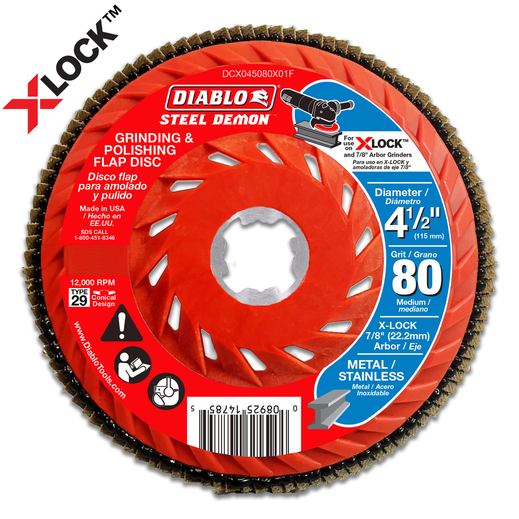 Diablo’s Steel Demon Grinding and Polishing Flap Discs grind and polish simultaneously to help you scale down and smooth out metal and stainless steel surfaces. Featuring X-Lock, these flap discs can be changed quickly, without the use of tools. A conical shape and 80-grit (medium) composition combine for 10X faster material removal, leaving behind a shiny surface that gives your work piece a revitalized appearance and/or operational resurgence. Designed to be backwards compatible, these discs work with X-Lock angle grinders and 7/8 in. arbor angle grinders when grinding and polishing metal materials.