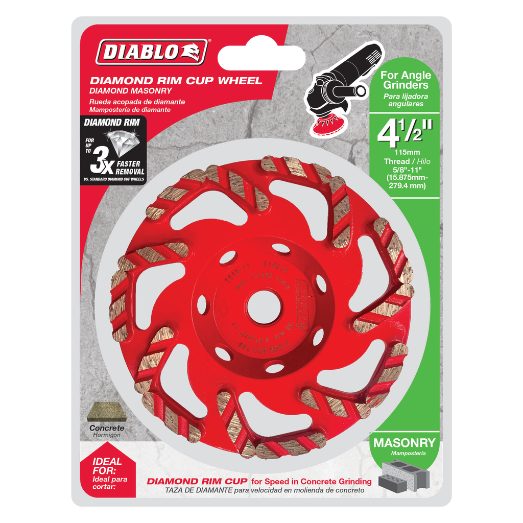 Diablo’s diamond cup wheels provide extreme durability, faster cuts and longer life in concrete grinding applications. These superior performing diamond cup wheels deliver up to 3X faster material removal versus standard diamond cup wheels. Extra-wide slots provide maximum dust extraction while the L-shaped diamond segments avoid gouging and swirl marks. Industrial-grade diamonds deliver lasting durability and maximizes quality in extreme applications.