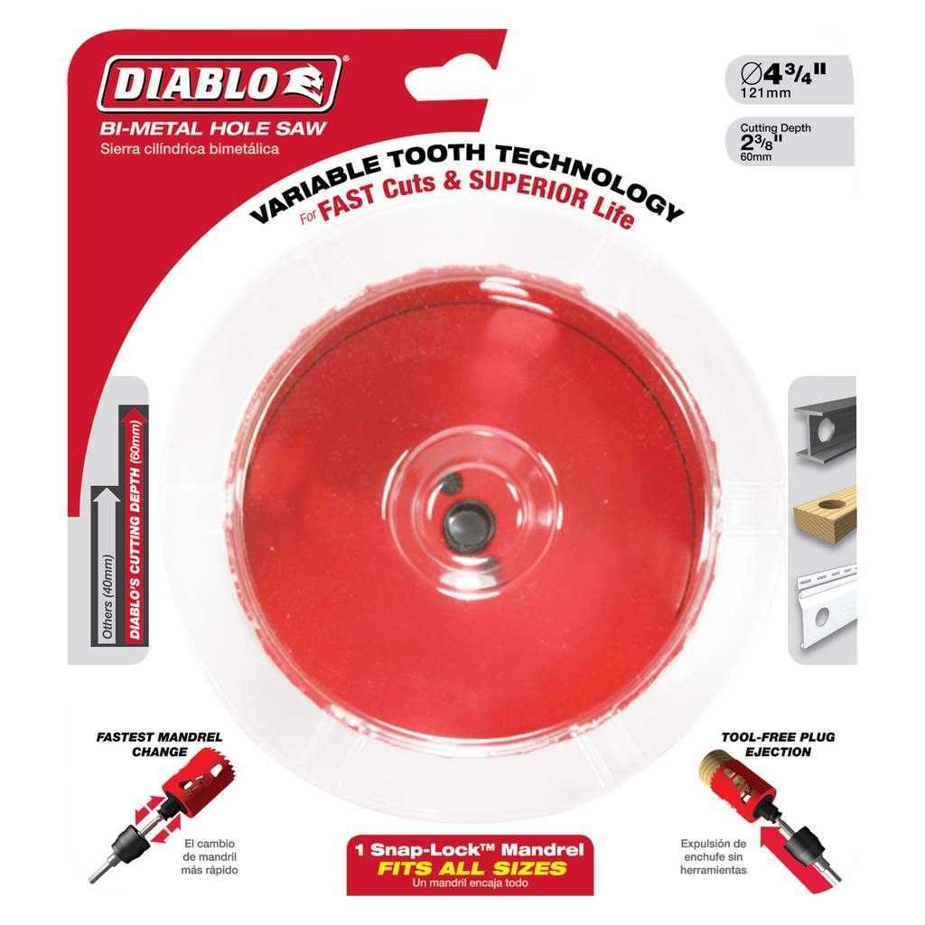 Diablo’s new, high performance hole saws deliver faster cutting performance and increased productivity. Unlike anything on the market, Diablo’s hole saw system and mandrel design simplify the attachment process for fast and efficient hole saw mounting. These radical new hole saws provide ultimate cutting length to bore deeper holes in a single pass, tool-free plug ejection and Variable Tooth Design for faster cuts.