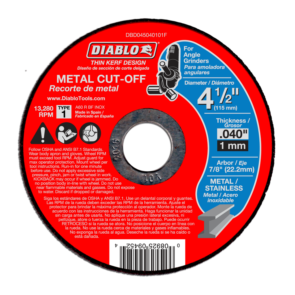 Engineered for precision cutting, the 4-1/2 inch Metal Cut Off Discs from Diablo Tools deliver exceptional performance on a variety of metal applications, including steel, stainless steel, cast iron, and sheet metal. This thin kerf design not only enhances cutting efficiency but also extends the lifespan of the disc, thanks to a premium aluminum oxide blend that facilitates fast material removal with minimal effort. Each disc is compatible with a 7/8-inch arbor and can operate at a maximum of 13,280 RPM, making them suitable for a wide range of tools and projects. This convenient 15-pack ensures you have a steady supply for all your cutting needs, whether you’re tackling rebar, angle iron, or other metallic materials.