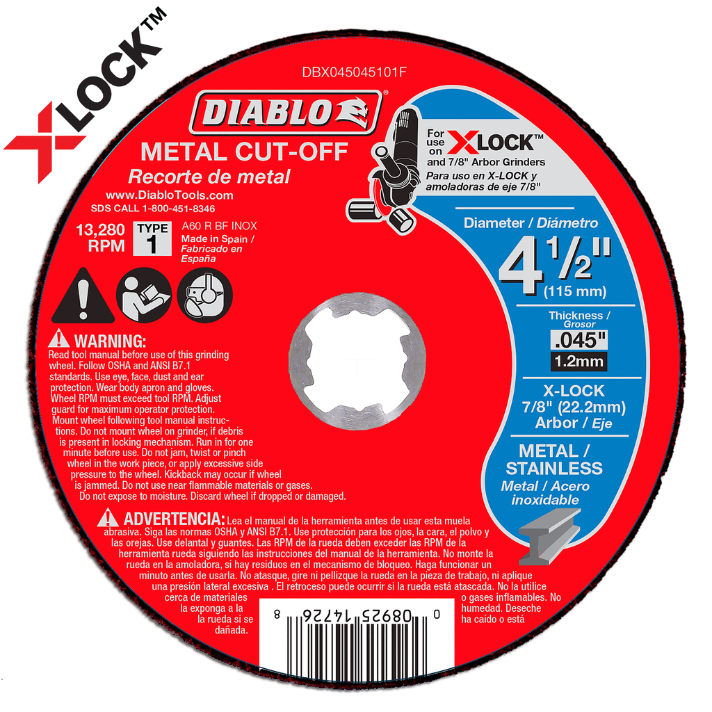 Diablo’s premium thin kerf metal cut-off discs deliver superior performance and increased productivity. Features a premium aluminum oxide blend that produces quick cuts and offers an extra-long cutting life. Unlike other bonded discs on the market, these discs feature a true 0.40 in. design. The thin kerf design provides for a thin cut, allowing your power tool to work at its full potential. Designed to be backwards compatible, these discs work with X-Lock and 7/8 in. arbor angle grinders when cutting metal and stainless steel.