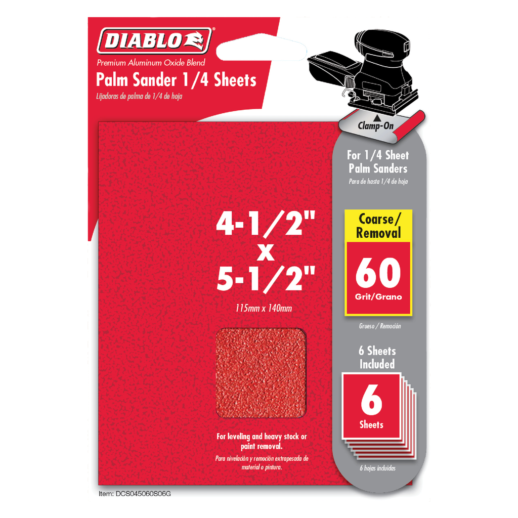 Diablo’s premium 4-1/2 in. x 5-1/2 in. 60-Grit (Coarse) Clamp-on Sanding Sheets include break-through innovations that improve performance, extend sanding life and increase productivity. These sanding sheets are designed for use in 1/4 sheet palm sanders and are ideal for all types of wood, metal and plastics.