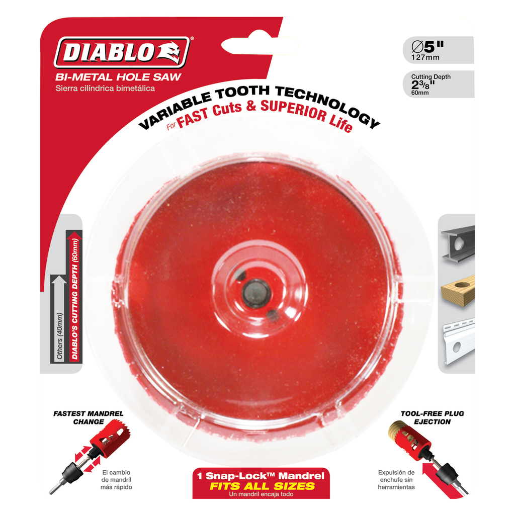 Diablo’s new, high performance hole saws deliver faster cutting performance and increased productivity. Unlike anything on the market, Diablo’s hole saw system and mandrel design simplify the attachment process for fast and efficient hole saw mounting. These radical new hole saws provide ultimate cutting length to bore deeper holes in a single pass, tool-free plug ejection and Variable Tooth Design for faster cuts.