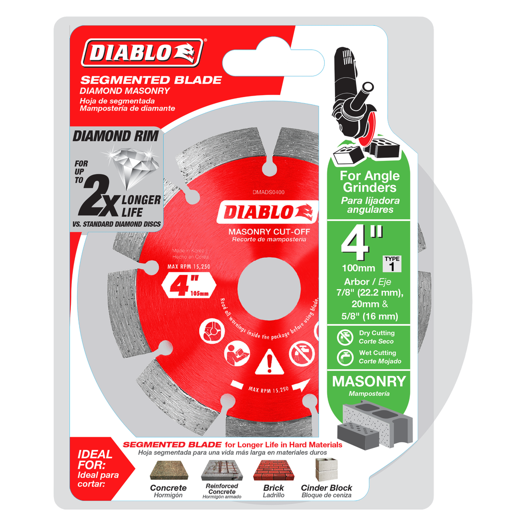 Diablo’s diamond segmented masonry cut-off discs provide extreme durability and longer life in concrete, concrete with rebar, brick and cinder block. These diamond rimmed discs deliver up to 2X longer cutting life versus standard diamond cut-off discs. The disc’s industrial-grade diamonds with hardened disc body delivers lasting durability and maximizes cutting quality in hardened materials even in extreme applications.