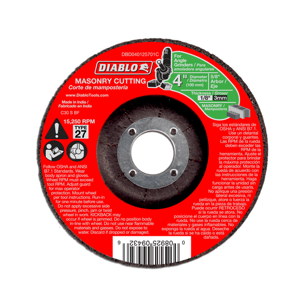 Diablo’s premium masonry cut-off discs provide superior performance and increased productivity. Featuring a premium silicone carbide blend, these discs cut through material faster than other cut-off discs and offer an extra long cutting life. Fully reinforced for use in hand-held cut-off work. Ideal for use when working in hard to reach areas.
