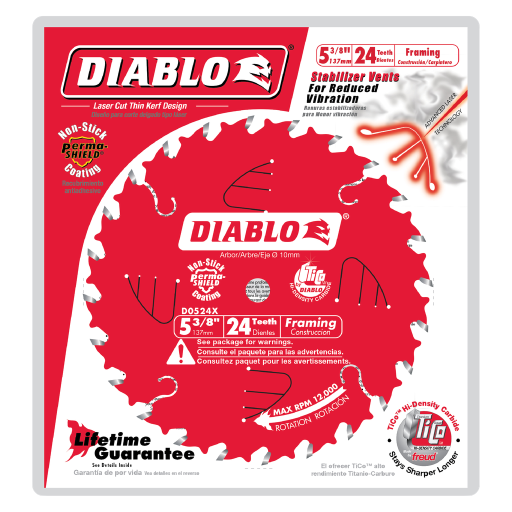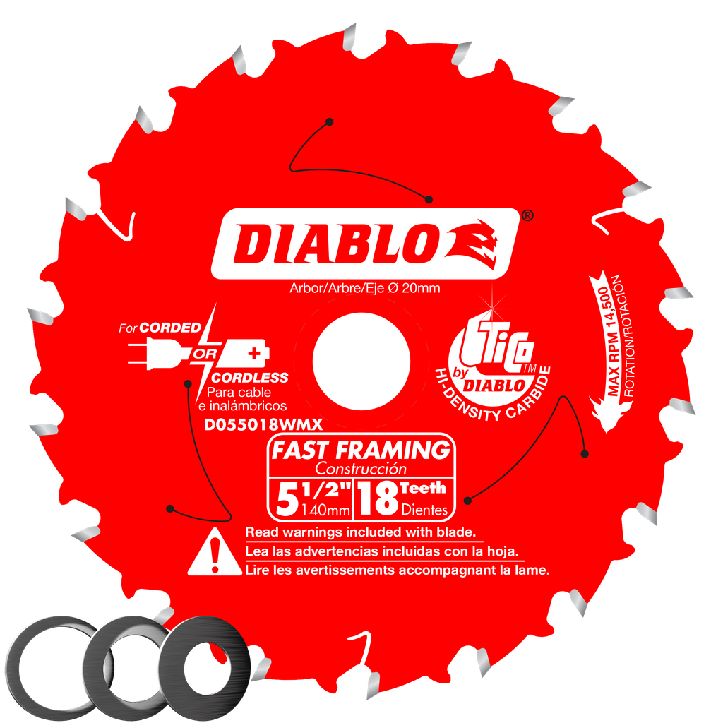 Diablo’s fast framing saw blades produce accurate, smooth cuts on framing materials without bogging down your cordless saw’s battery. This 20mm arbor saw blade includes three additional bushings that allow your blade to also fit on 1/2″, 5/8” or 10mm arbor saws. These blades feature Diablo made TiCo Hi-Density Carbide engineered exclusively to maximize life, performance and durability in wood cutting applications. The thin kerf body minimizes material removal and requires less cutting power, delivering fast, clean rips and cuts.