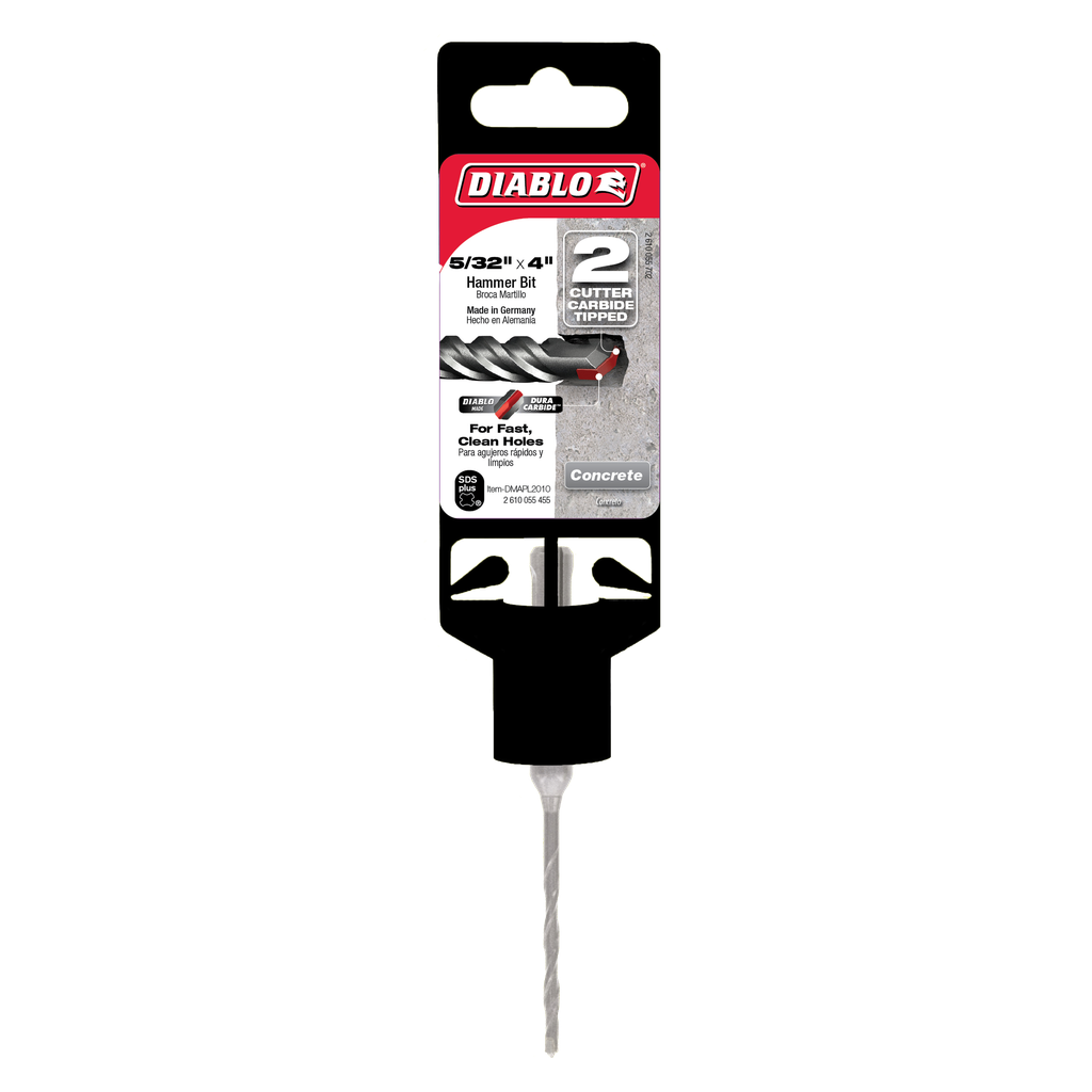Diablo’s SDS-Plus 2-cutter carbide-tipped hammer drill bits provide one of the fastest and longest lasting drilling solutions on the market for concrete. Optimized with a unique brazing and hardening process, the carbide tips extends life and productivity, allowing users to drill fast, accurate holes. The Peak Point tip design allows for aggressive starts that produce clean, fast holes for common sized anchors. Optimized for maximum performance in corded and cordless SDS Plus rotary hammers.