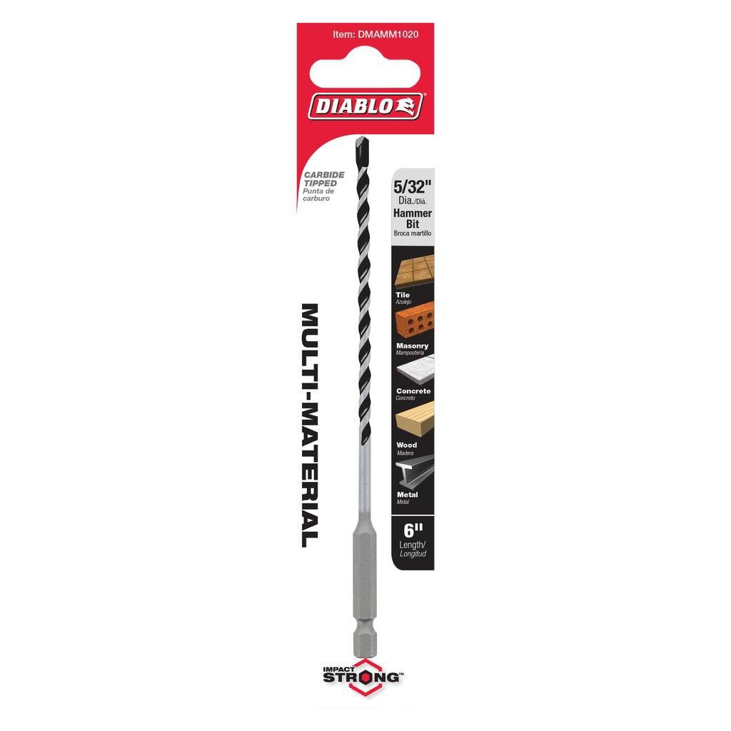 Diablo’s Multi-Material Carbide Tipped Hammer Drill Bit range provides faster starts and longer life in tile, masonry, concrete, wood and metal. Optimized with a unique brazing and hardening process, the carbide tip extends life and productivity, allowing users to drill faster holes. The multi-ground Grip Point tip design allows for aggressive starts that produce clean, fast holes in a variety of applications. This range is Impact Strong™ for increased shank stability and durability in cordless and corded impact and drill drivers.