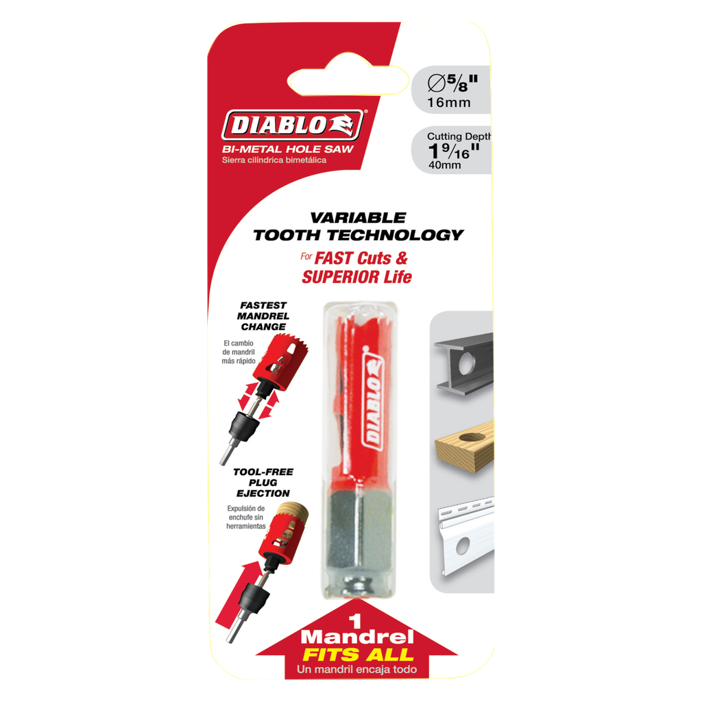 Diablo’s new, high performance hole saws deliver faster cutting performance and increased productivity. Unlike anything on the market, Diablo’s hole saw system and mandrel design simplify the attachment process for fast and efficient hole saw mounting. These radical new hole saws provide ultimate cutting length to bore deeper holes in a single pass, tool-free plug ejection and Variable Tooth Design for faster cuts.