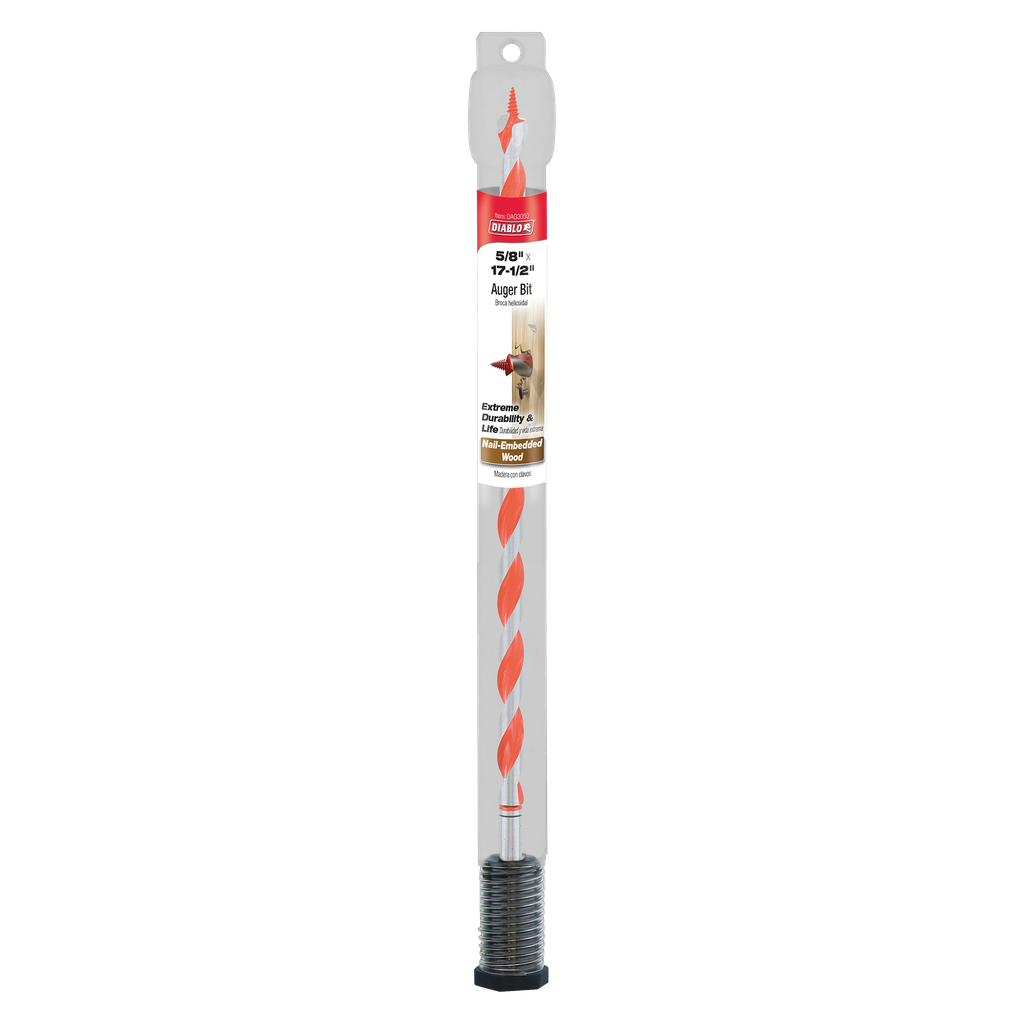 Diablo’s Auger Bit range provides maximum performance, extreme durability and superior life in nail-embedded wood applications. A two-step cutting action creates holes that are precise and clean. The self-feeding Dura-Tip™ pulls the bit while the dual cutting edge delivers an effortless, smooth drilling experience in wood with nails. Deep flutes enhance the chip evacuation process for more holes per charge. Quick change shank increases stability and durability in cordless and corded impact wrenches and drill drivers.