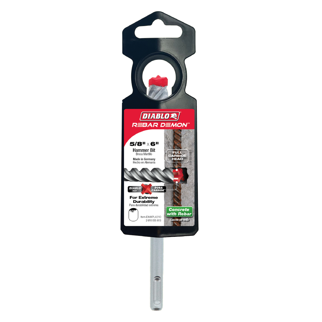 Diablo’s revolutionary, most complete range of SDS-Plus and SDS-Max Rebar Demon™ 4-cutter full-carbide head hammer drill bits are the only bits designed to be the most durable, fastest and coolest solutions on the market. The Rebar Demon bits feature up to 2X more Dura-Carbide to withstand up to 1800°F of intense heat whereas standard bits fail at 800°F. Diablo’s impact resistant 4-cutter full-carbide head withstands the stress of high-powered hammer drills and the impact of rebar by taking small bites of rebar to deliver controlled carbide wear, reduced vibration and up to 7X longer life. Produced with Tri-Metal Fusion Welding, the full-carbide head resists heat and prevents breakage in extreme impact situations. Precision Tip delivers the stability and accuracy required to produce fast, precise holes in reinforced concrete for anchor setting.
