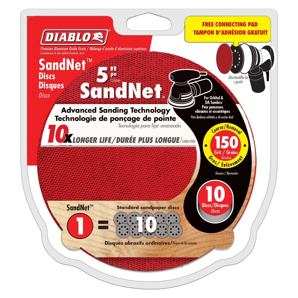 Diablo’s SandNet™ discs with reusable sanding technology are the most advanced sanding discs on the market with up to 10x longer life versus standard sanding discs. The universal net design fits all 5 and 8-hole sanders. Each SandNet™ discs features a clog-reducing nylon net design coated in a premium ceramic blend grit for fast material removal while reducing material build-up. The SandNet™ design is easy to clean and reuse multiple times by simply shaking, vacuuming, or rinsing the disc to remove any pitch build-up. Includes a free connection pad (a $5 value) for easy attachment to sander.