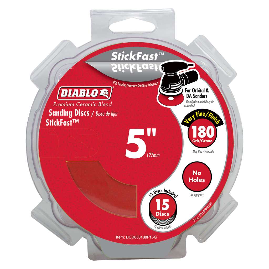 Diablo’s premium 5 in. 180-Grit random orbital sanding (ROS) discs with StickFast™ backing include break-through innovations that improve performance, extend sanding life and increase productivity. Featuring a premium ceramic blend, these discs remove material faster than other sanding discs and offer an extra long sanding life. Clog-SHIELD™, Diablo’s own blend of grinding agents, reduces loading thus maximizing productivity. The superior grain bonding system, ENDURA-BOND™, provides Diablo’s sanding discs with longer life and extreme durability.