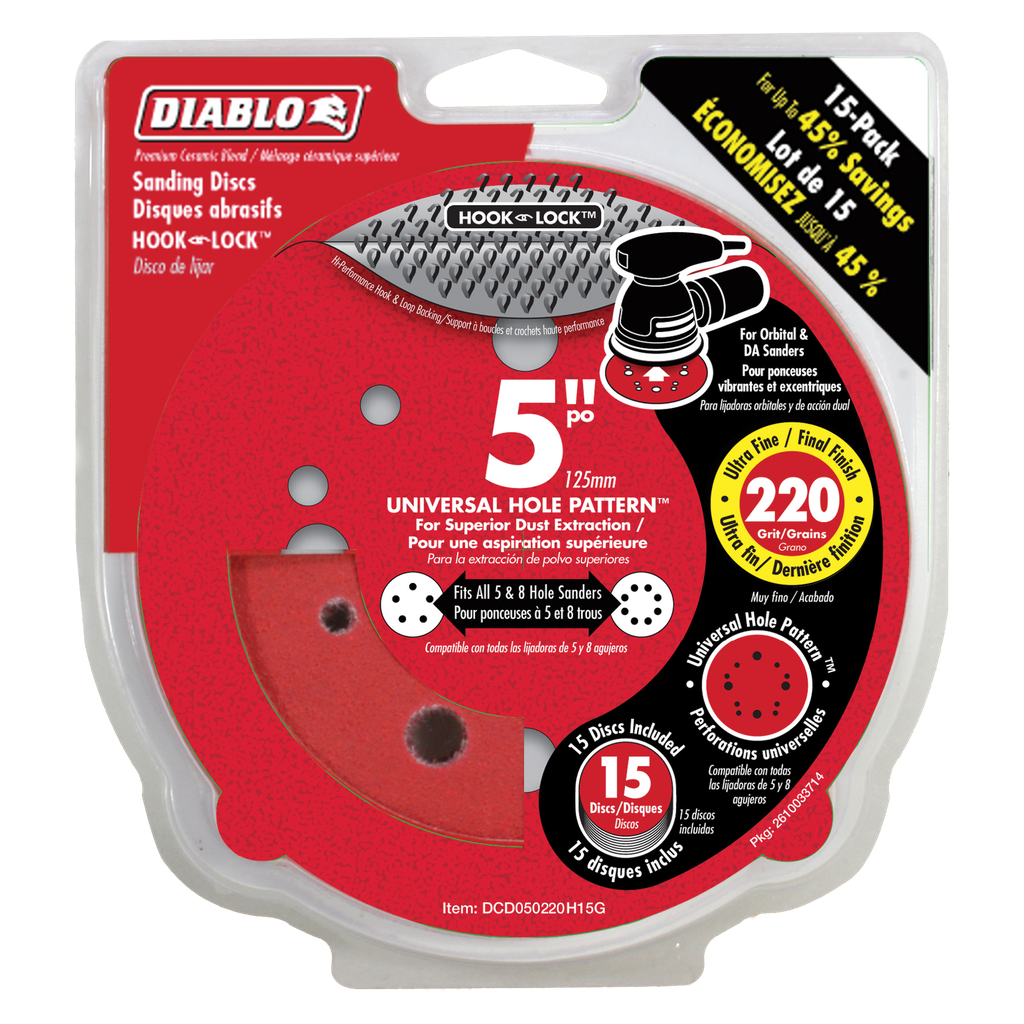 Diablo’s premium 5 in. 220-Grit universal, 12-hole random orbital sanding (ROS) discs with Hook & Lock™ backing include break-through innovations that improve performance, extend sanding life and increase productivity. Featuring a premium ceramic blend, these discs remove material faster than other sanding discs and offer an extra long sanding life. Clog-SHIELD™, Diablo’s own blend of grinding agents, reduces loading thus maximizing productivity. The superior grain bonding system, ENDURA-BOND™, provides Diablo’s sanding discs with longer life and extreme durability.