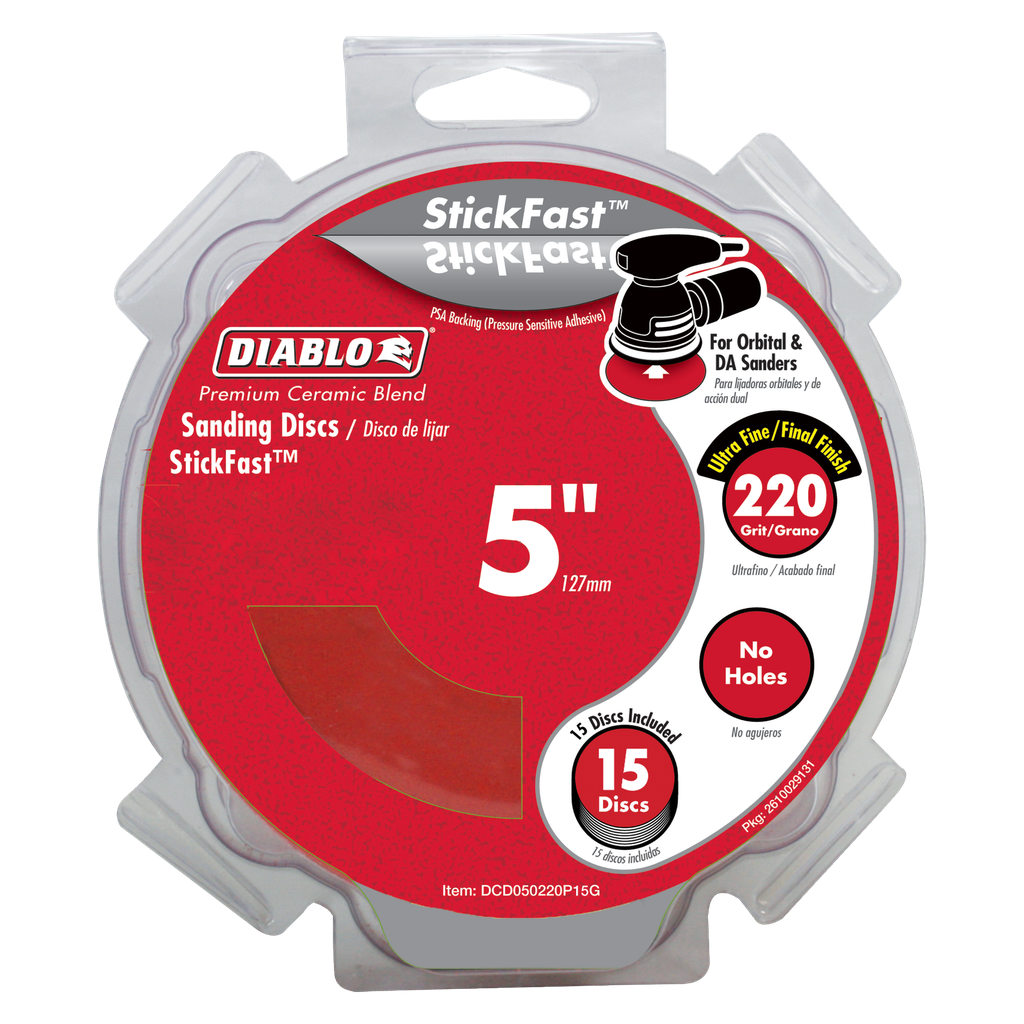 Diablo’s premium 5 in. 220-Grit random orbital sanding (ROS) discs with StickFast™ backing include break-through innovations that improve performance, extend sanding life and increase productivity. Featuring a premium ceramic blend, these discs remove material faster than other sanding discs and offer an extra long sanding life. Clog-SHIELD™, Diablo’s own blend of grinding agents, reduces loading thus maximizing productivity. The superior grain bonding system, ENDURA-BOND™, provides Diablo’s sanding discs with longer life and extreme durability.