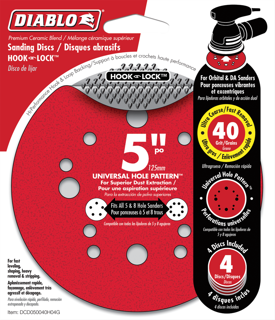 Diablo’s premium 5 in. 60-Grit universal random orbital sanding (ROS) discs with Hook & Lock™ backing include break-through innovations that improve performance, extend sanding life and increase productivity. Featuring a premium ceramic blend, these discs remove material faster than other sanding discs and offer an extra long sanding life. Clog-SHIELD™, Diablo’s own blend of grinding agents, reduces loading thus maximizing productivity. The superior grain bonding system, ENDURA-BOND™, provides Diablo’s sanding discs with longer life and extreme durability.