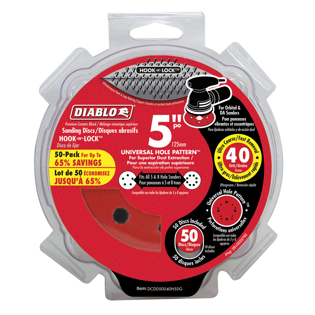 Diablo’s premium 5 in. 60-Grit universal random orbital sanding (ROS) discs with Hook & Lock™ backing include break-through innovations that improve performance, extend sanding life and increase productivity. Featuring a premium ceramic blend, these discs remove material faster than other sanding discs and offer an extra long sanding life. Clog-SHIELD™, Diablo’s own blend of grinding agents, reduces loading thus maximizing productivity. The superior grain bonding system, ENDURA-BOND™, provides Diablo’s sanding discs with longer life and extreme durability.