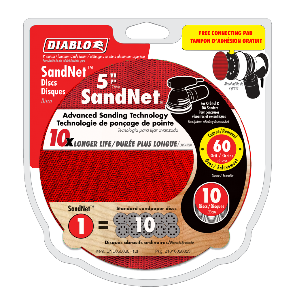 Diablo’s SandNet™ discs with reusable sanding technology are the most advanced sanding discs on the market with up to 10x longer life versus standard sanding discs. The universal net design fits all 5 and 8-hole sanders. Each SandNet™ discs features a clog-reducing nylon net design coated in a premium ceramic blend grit for fast material removal while reducing material build-up. The SandNet™ design is easy to clean and reuse multiple times by simply shaking, vacuuming, or rinsing the disc to remove any pitch build-up. Includes a free connection pad (a $5 value) for easy attachment to sander.