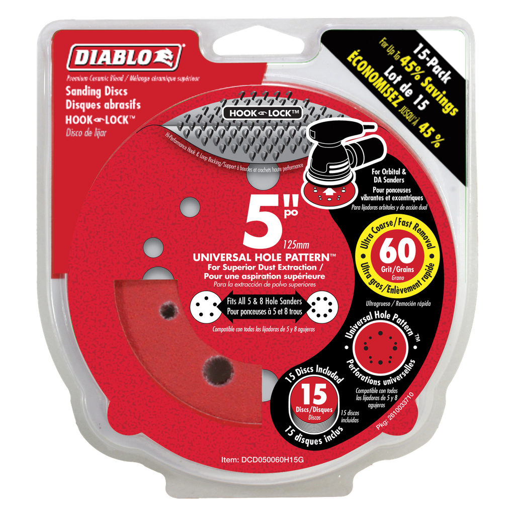 Diablo’s premium 5 in. 60-Grit universal, 12-hole random orbital sanding (ROS) discs with Hook & Lock⢠backing include break-through innovations that improve performance, extend sanding life and increase productivity. Featuring a premium ceramic blend, these discs remove material faster than other sanding discs and offer an extra long sanding life. Clog-SHIELDā¢, Diablo’s own blend of grinding agents, reduces loading thus maximizing productivity. The superior grain bonding system, ENDURA-BONDā¢, provides Diablo’s sanding discs with longer life and extreme durability.