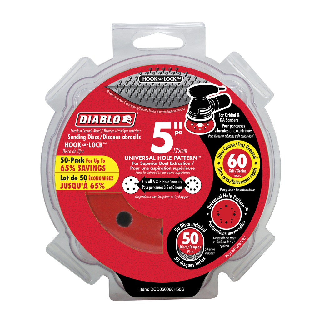 Diablo’s premium 5 in. 60-Grit universal, 12-hole random orbital sanding (ROS) discs with Hook & Lock™ backing include break-through innovations that improve performance, extend sanding life and increase productivity. Featuring a premium ceramic blend, these discs remove material faster than other sanding discs and offer an extra long sanding life. Clog-SHIELD™, Diablo’s own blend of grinding agents, reduces loading thus maximizing productivity. The superior grain bonding system, ENDURA-BOND™, provides Diablo’s sanding discs with longer life and extreme durability.