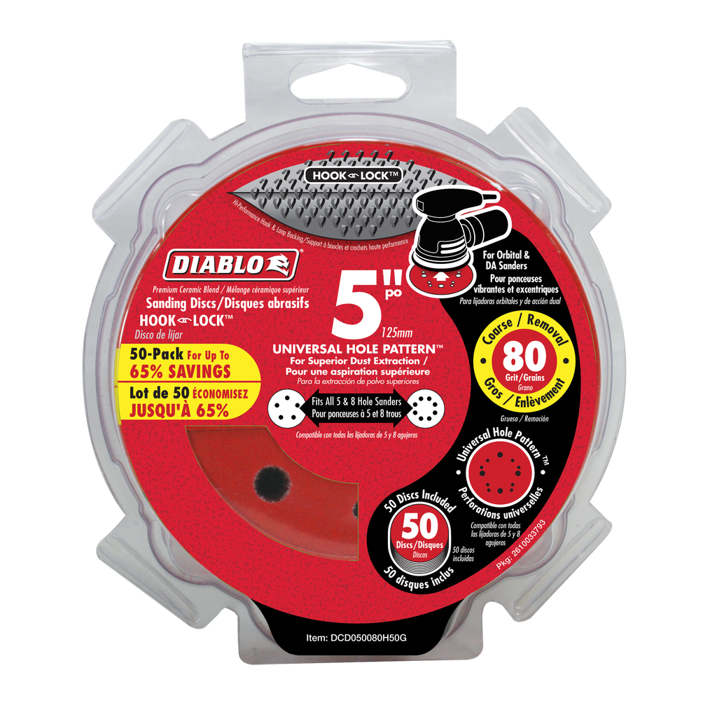 Diablo’s premium 5 in. 80-Grit universal, 12-hole random orbital sanding (ROS) discs with Hook & Lock™ backing include break-through innovations that improve performance, extend sanding life and increase productivity. Featuring a premium ceramic blend, these discs remove material faster than other sanding discs and offer an extra long sanding life. Clog-SHIELD™, Diablo’s own blend of grinding agents, reduces loading thus maximizing productivity. The superior grain bonding system, ENDURA-BOND™, provides Diablo’s sanding discs with longer life and extreme durability.