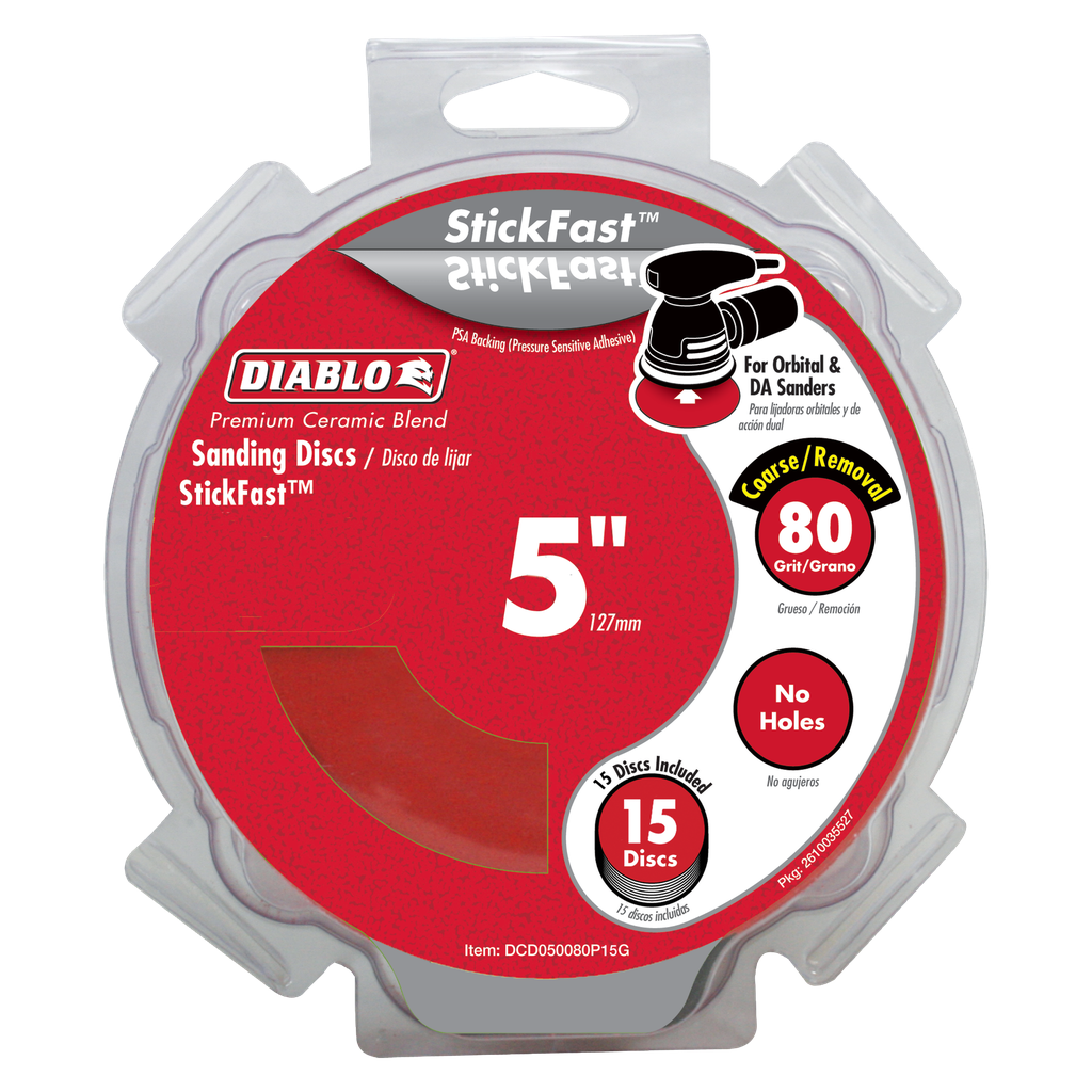Diablo’s premium 5 in. 80-Grit random orbital sanding (ROS) discs with StickFast™ backing include break-through innovations that improve performance, extend sanding life and increase productivity. Featuring a premium ceramic blend, these discs remove material faster than other sanding discs and offer an extra long sanding life. Clog-SHIELD™, Diablo’s own blend of grinding agents, reduces loading thus maximizing productivity. The superior grain bonding system, ENDURA-BOND™, provides Diablo’s sanding discs with longer life and extreme durability.