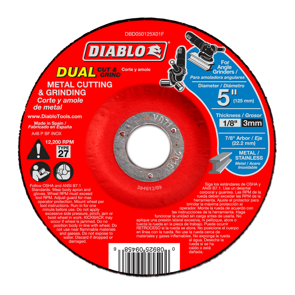Experience the innovation of the 5-inch Metal Dual Cut & Grind Disc from Diablo Tools, a groundbreaking tool designed for cutting and grinding simultaneously. This dual-function disc features a premium aluminum oxide blend that ensures efficient material removal along with an extended grinding life, making it an excellent choice for various metal applications including steel, stainless steel, cast iron, sheet metal, and rebar. With a Type 27 depressed center design and a robust construction suited for high-speed operations, it supports a maximum RPM of 12,200, making it ideal for both professional and DIY projects. Whether you’re working with angle iron or tackling tougher materials, this disc is engineered to enhance productivity while delivering precise results.