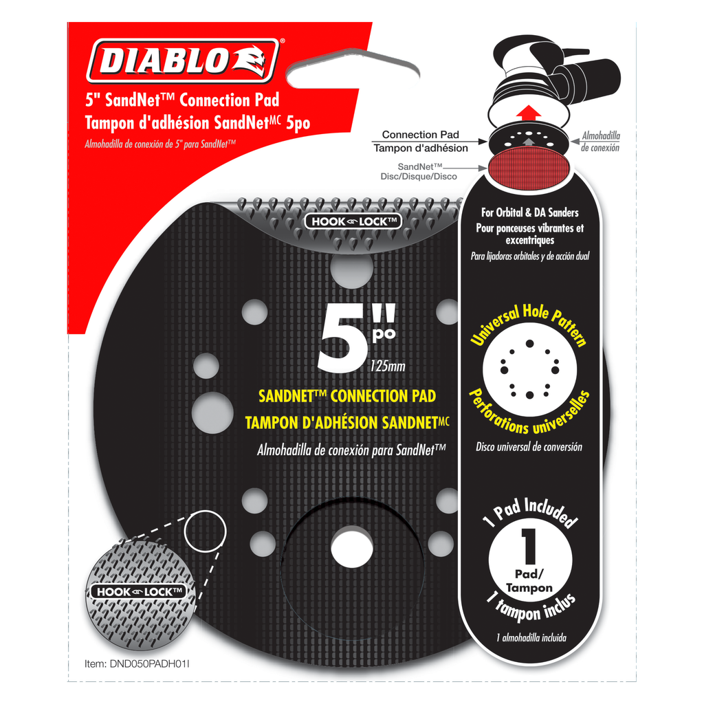 Diablo’s SandNet connection pad allows users to effortlessly attach the Diablo SandNet disc to their random orbital sander. This easy-to-use connection pad is designed for a universal fit on all 5 and 8-hole sanders. The SandNet connection pad provides a barrier of protection between the SandNet disc and the sander’s platform for less dust build up and longer sanding life. Use this connection pad on all grits of Diablo SandNet.