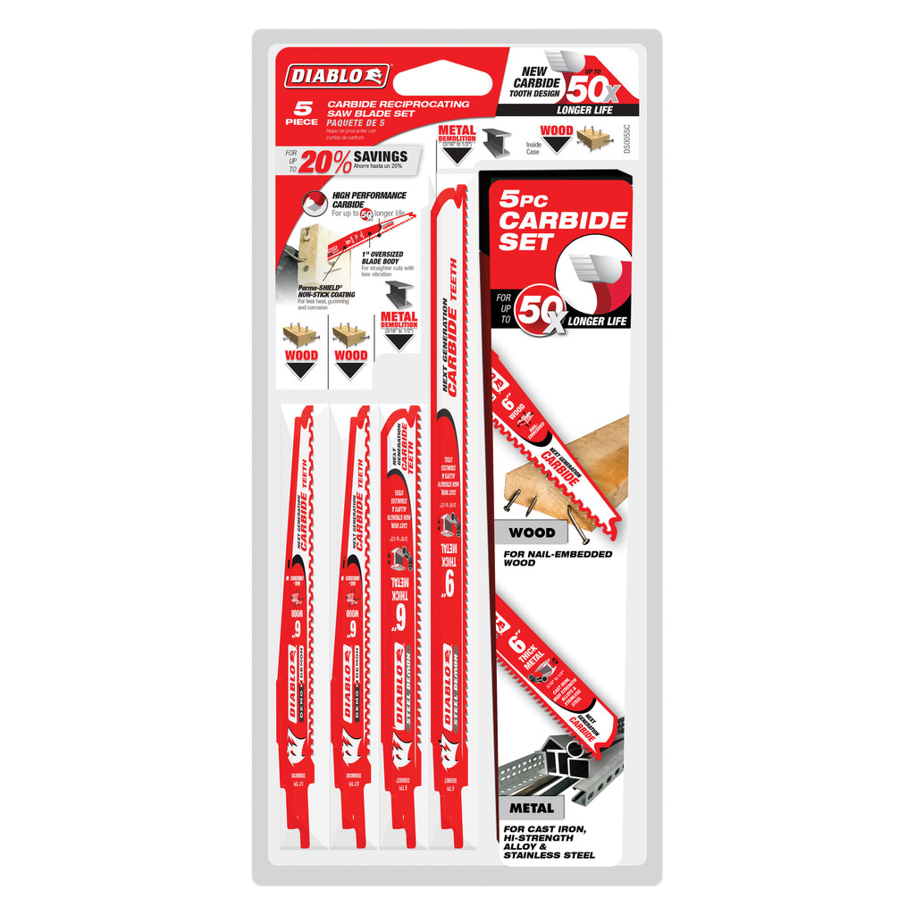 5-Piece Carbide Reciprocating Blade Set consists of three Demo Demon blades for nail-embedded wood and 2-Steel Demon blades for metal cutting, including high strength alloys, cast iron and stainless steel. This combination carbide reciprocating blade set allows PROs to blaze through nail-embedded wood with amazing ease to facilitate fast teardowns of walls and framing materials; and slice through metal so you can quickly dismantle a variety of pipes, bars and beams up to 9/16in. thick. Diablo’s high performance carbide set delivers unmatched 50X longer cutting life than standard bi-metal blades, greater durability in cutting applications and an oversized body height for straighter cuts with less vibration.
