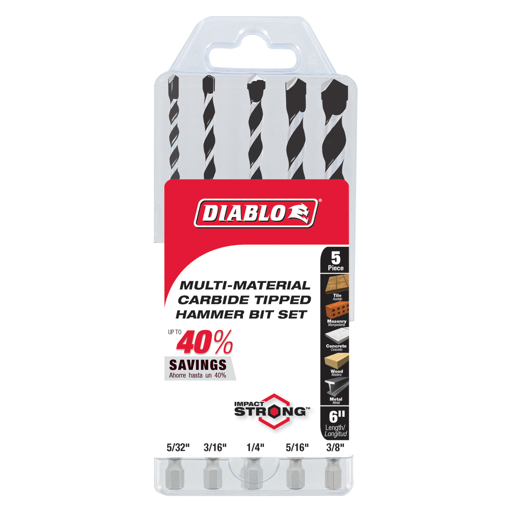 Diablo’s Multi-Material Carbide Tipped Hammer Drill Bit range provides faster starts and longer life in tile, masonry, concrete, wood and metal. Optimized with a unique brazing and hardening process, the carbide tip extends life and productivity, allowing users to drill faster holes. The multi-ground Grip Point tip design allows for aggressive starts that produce clean, fast holes in a variety of applications. This range is Impact Strong™ for increased shank stability and durability in cordless and corded impact and drill drivers.