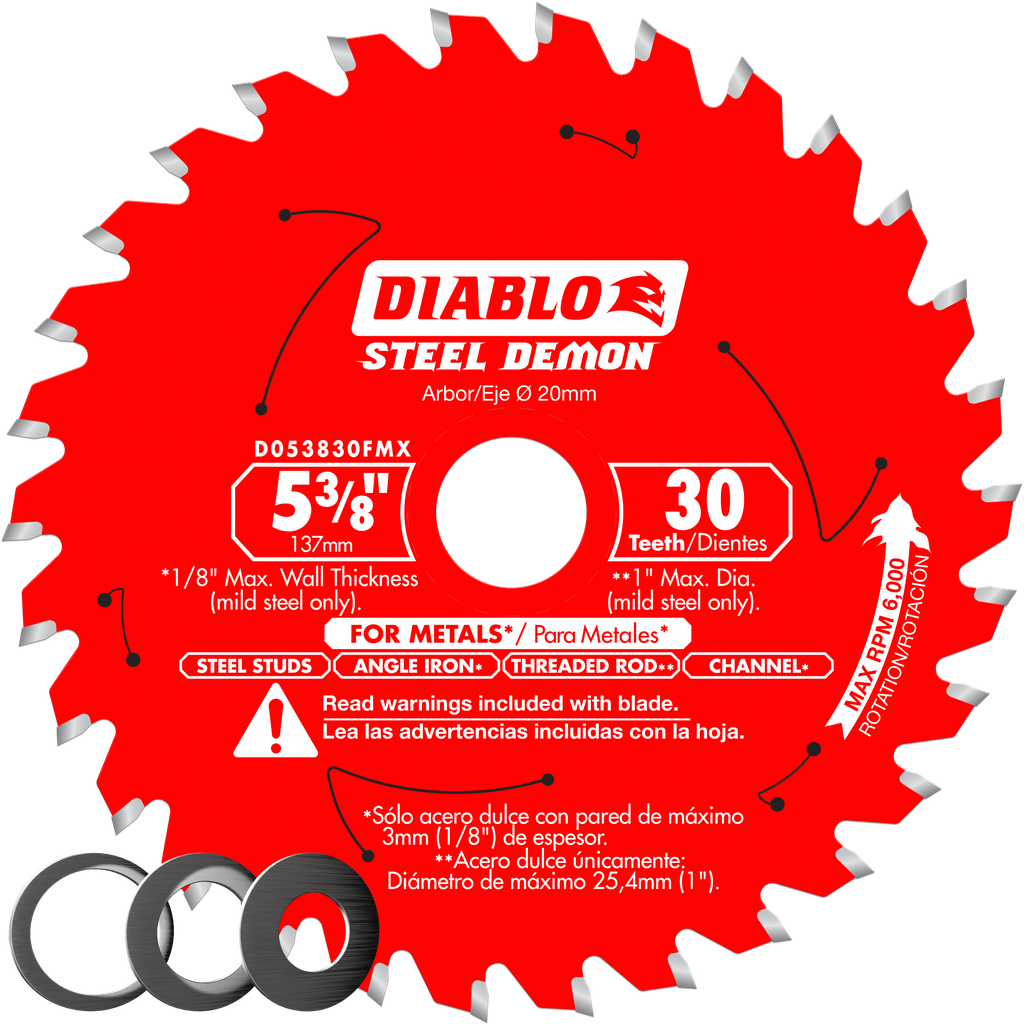 Diablo’s Steel Demon metal cutting saw blades produce fast, accurate cuts in mild steels without bogging down your cordless saw’s battery. This 20mm arbor saw blade includes three additional bushings that allow your blade to also fit on 1/2″, 5/8” or 10mm arbor saws. These blades feature Diablo made TiCo Hi-Density Carbide engineered exclusively to deliver up to 40 times longer life when compared to one standard bonded abrasive disc in mild steel applications. Designed with a Triple Chip Grind (TCG), the blade’s carbide teeth produce clean, burr-free finishes, virtually eliminating any type of rework. The thin kerf body minimizes material removal and requires less cutting power, delivering fast, clean cuts.