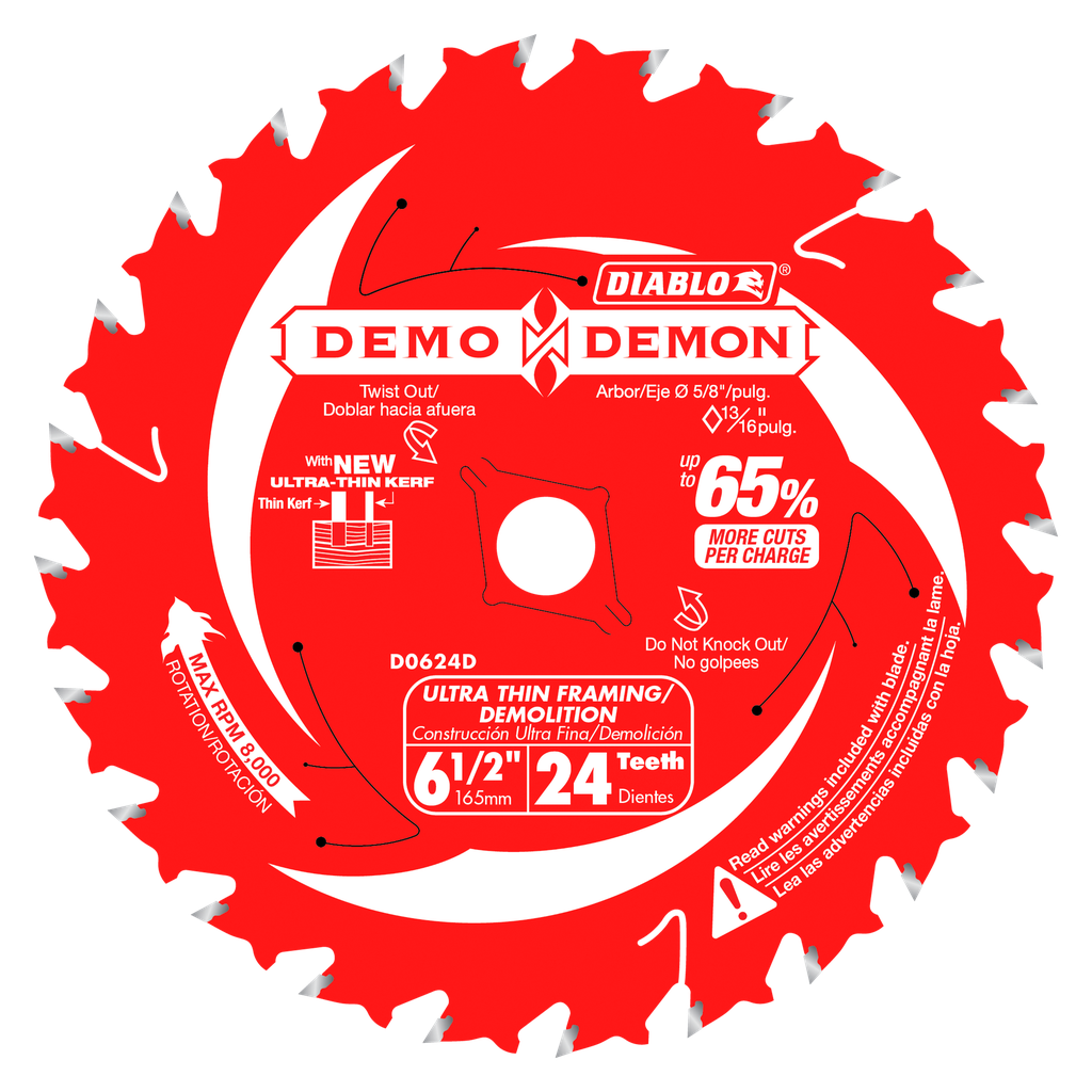 Diablo’s next generation 6-1/2 in. 24-tooth Ultra-Thin Framing/Demolition saw blade features industry first technology to deliver extreme performance, superior control and maximum efficiency in cordless and corded saws. Dura-Carbide™, a specialized blend of Diablo made TiCo™ hi-density carbide, extends cutting life up to 10-times and doubles the durability versus standard blades in demolition applications. Chamber Alternate Top Bevel tooth geometry features a three-tooth grind sequence for ultimate tracking control, while a 1.35mm kerf blade introduces the industry’s first and only ultra-thin blade body for up to 65% more cuts per charge. Lock-Tooth™ technology ensures the strongest tip-to-blade connection in extreme impact situations when encountering abrasive materials such as shingles, bolts or nail-embedded wood.