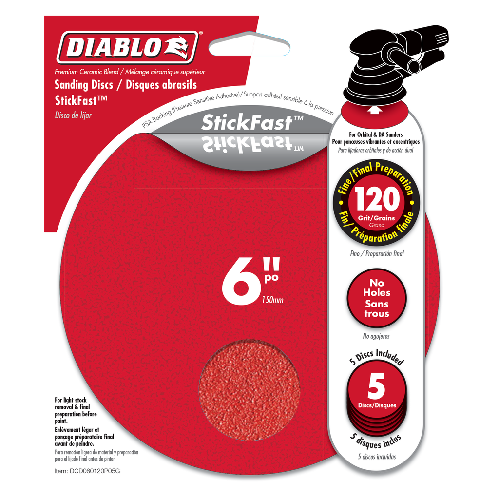 Diablo’s premium 6 in. 120-Grit (Fine) Random Orbital Sanding Discs with StickFast™ backing include break-through innovations that improve performance, extend sanding life and increase productivity. Featuring a premium ceramic blend, these discs remove material faster than other sanding discs and offer an extra long sanding life. Clog-SHIELD™, Diablo’s own blend of grinding agents, reduces loading thus maximizing productivity. The superior grain bonding system, ENDURA-BOND™, provides Diablo’s sanding discs with longer life and extreme durability.