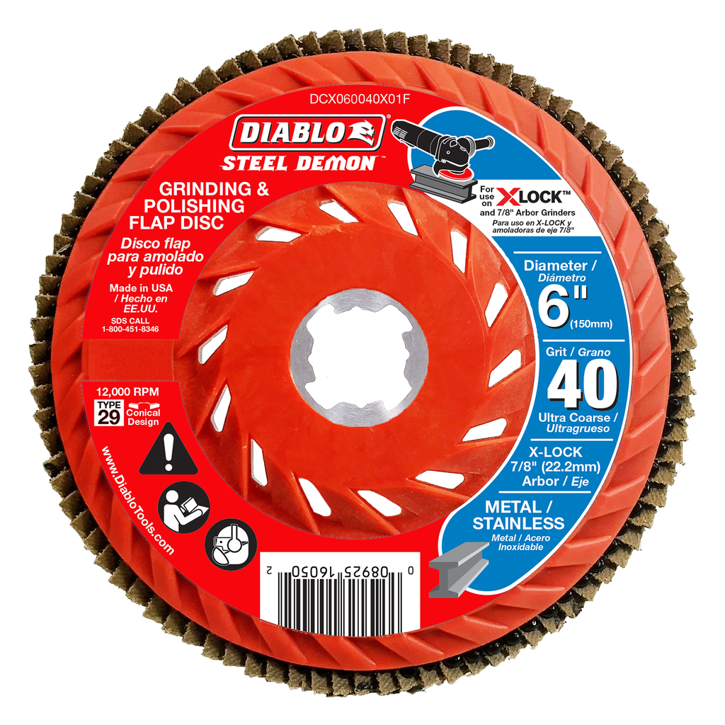 Diablo’s Steel Demon Grinding and Polishing Flap Discs grind and polish simultaneously to help you scale down and smooth out metal and stainless steel surfaces. Featuring X-Lock, these flap discs can be changed quickly, without the use of tools. A conical shape and 40-grit (ultra-coarse) composition combine for 10X faster material removal, leaving behind a shiny surface that gives your work piece a revitalized appearance and/or operational resurgence. Designed to be backwards compatible, these discs work with X-Lock angle grinders and 7/8 in. arbor angle grinders when grinding and polishing metal materials.