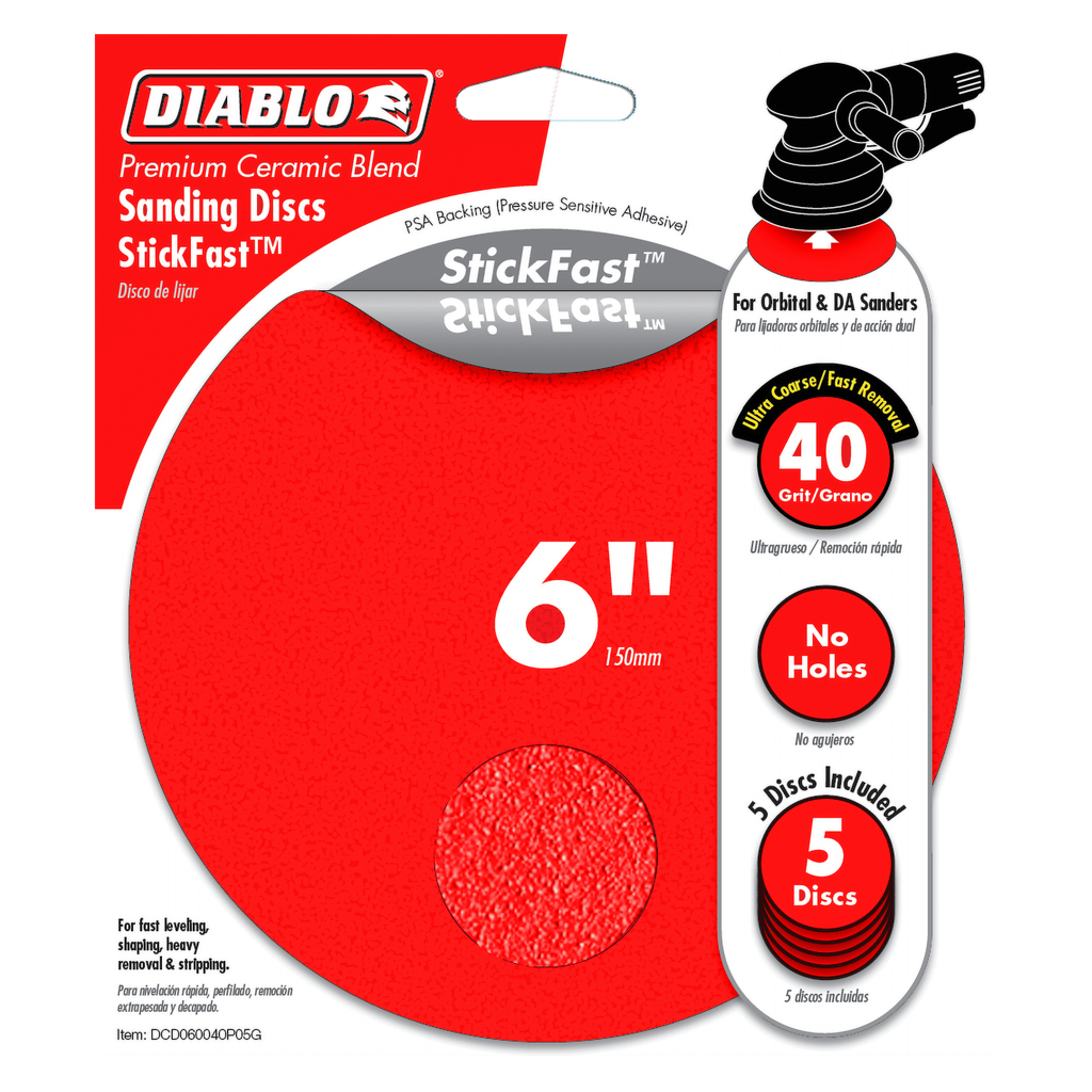 Diablo’s premium 6 in. 40-Grit (Ultra Coarse) random orbital sanding discs with StickFast™ backing include break-through innovations that improve performance, extend sanding life and increase productivity. Featuring a premium ceramic blend, these discs remove material faster than other sanding discs and offer an extra long sanding life. Clog-SHIELD™, Diablo’s own blend of grinding agents, reduces loading thus maximizing productivity. The superior grain bonding system, ENDURA-BOND™, provides Diablo’s sanding discs with longer life and extreme durability.