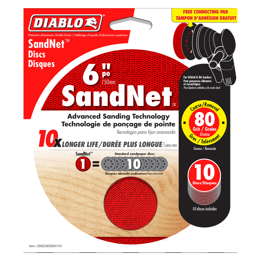 Diablo’s SandNet™ discs with reusable sanding technology are the most advanced sanding discs on the market with up to 10x longer life versus standard sanding discs. The universal net design fits all 5 and 8-hole sanders. Each SandNet™ discs features a clog-reducing nylon net design coated in a premium ceramic blend grit for fast material removal while reducing material build-up. The SandNet™ design is easy to clean and reuse multiple times by simply shaking, vacuuming, or rinsing the disc to remove any pitch build-up. Includes a free connection pad (a $5 value) for easy attachment to sander.