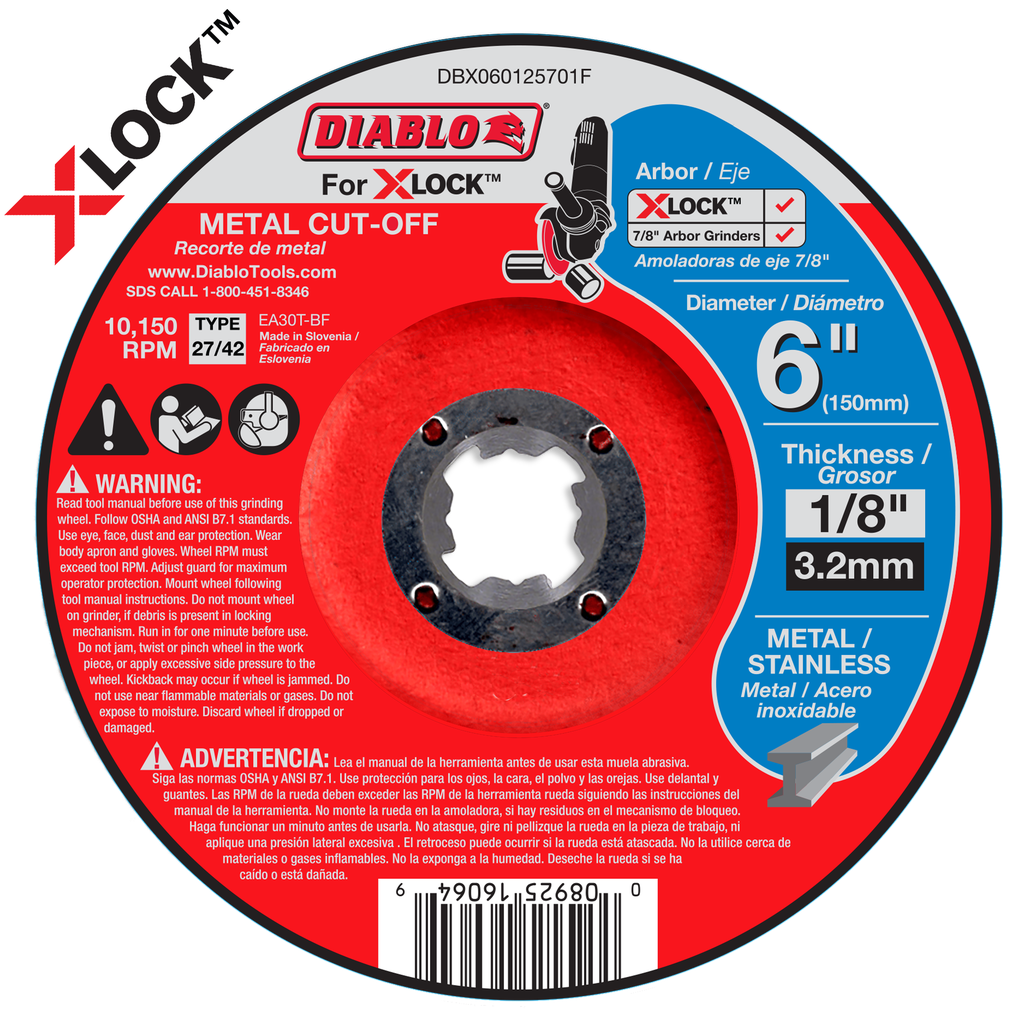 Diablo’s premium Type 27 depressed center metal cut-off discs deliver superior performance and increased productivity to allow your tool to work at its full potential. Features a premium aluminum oxide blend that produces quick cuts and offers an extra-long cutting life. Designed to be backwards compatible, these discs work with X-Lock and all 7/8 in. arbor angle grinders when cutting metal and stainless steel.