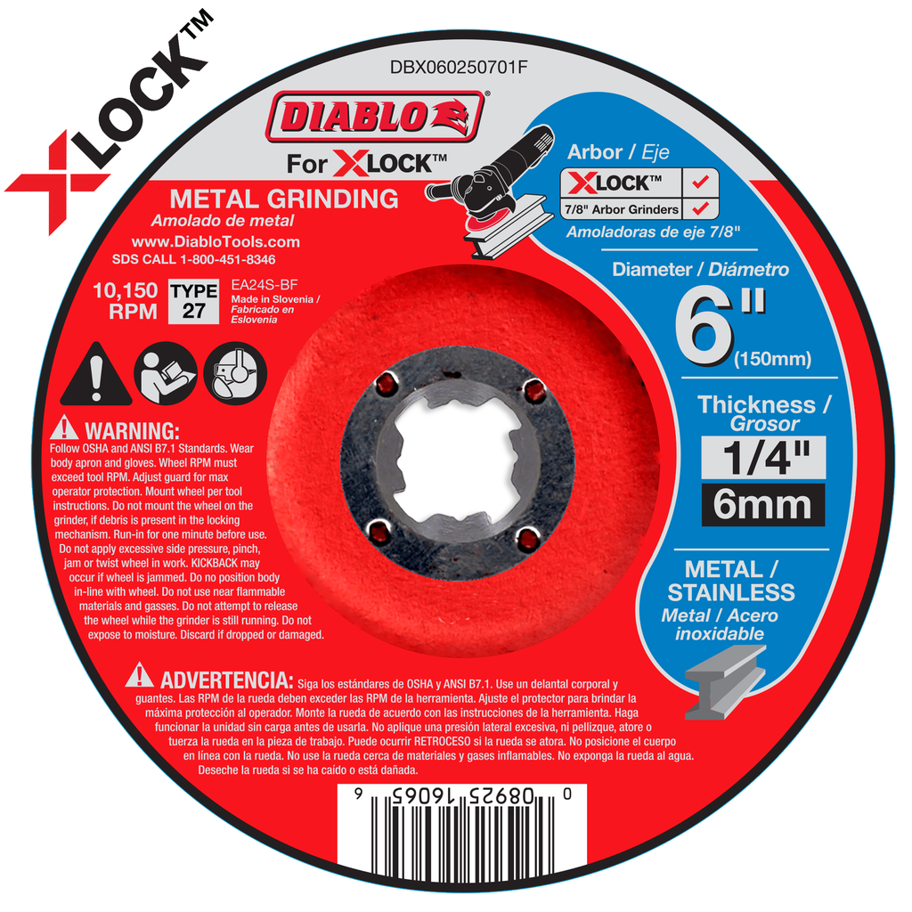 Diablo’s premium Type 27 depressed center metal grinding discs deliver superior performance and increased productivity to allow your tool to work at its full potential. Features a premium aluminum oxide blend that produces quick cuts and offers an extra-long grinding life. Designed to be backwards compatible, these discs work with X-Lock angle grinders and 7/8 in. arbor angle grinders when cutting metal and stainless steel.