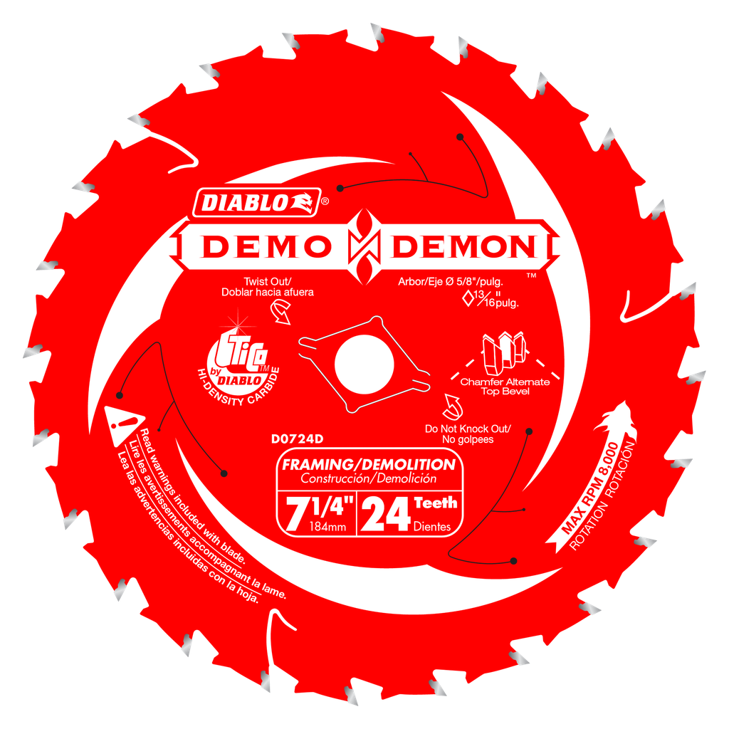 Diablo’s 7-1/4 in. 24-tooth Demo Demon™ Framing/Demolition saw blade features industry first technology to deliver extreme performance, superior control and maximum efficiency in cordless and corded saws. Dura-Carbide™, a specialized blend of Diablo made TiCo™ hi-density carbide, extends cutting life up to 10-times and doubles the durability versus standard blades in demolition applications. Chamber Alternate Top Bevel tooth geometry features a three-tooth grind sequence for ultimate tracking control, while a super-thin kerf blade body delivers up to 65% more cuts per charge. Lock-Tooth™ technology ensures the strongest tip-to-blade connection in extreme impact situations when encountering abrasive materials such as shingles, bolts or nail-embedded wood.
